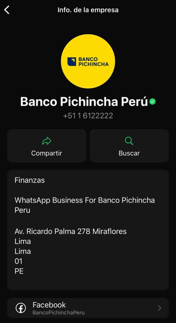 - El WhatsApp del Banco tiene una cuenta verificada, el nombre del banco y el logo oficial. Identifícalo como se muestra en la siguiente imagen: